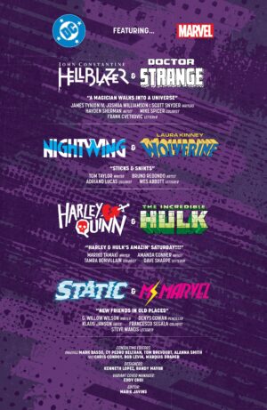 Nie przegap także tych niesamowitych dodatkowych opowieści: Scott Snyder, James Tynion IV i Joshua Williamson współpracują z Haydenem Shermanem przy magicznej historii z udziałem Constantine’a i Doktora Strange’a! Tom Taylor i Bruno Redondo serwują epicką opowieść o Nightwingu/Dicku Graysonie i Laurze Kinney/Wolverine! Mariko Tamaki i Amanda Conner zderzają Harley Quinn z Hulkiem! G. Willow Wilson i Denys Cowan opowiadają elektryzującą historię o Staticu i Ms. Marvel!