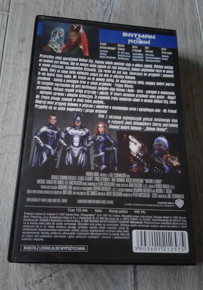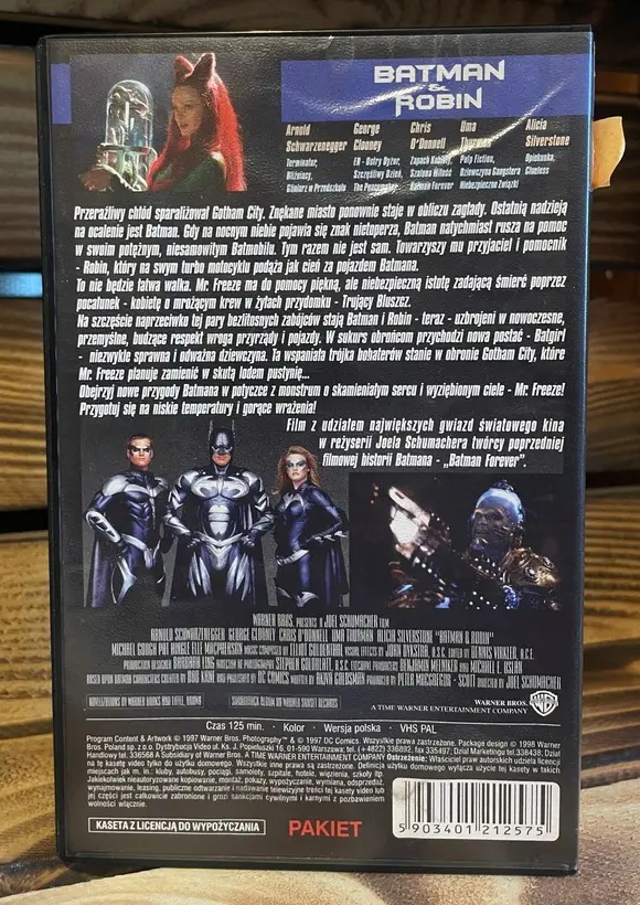 Batman i Robin zadebiutował na naszym rynku VHS w styczniu 1998 roku. Niesławny sequel Joela Schumachera sprzedawany był osobno, lub w pakiecie z innym tytułem Warner Bros. Z tego powodu w sieci można znaleźć dwa warianty okładki, ale pod oboma kryła się dokładnie taka sama kaseta, a na niej film w wersji z dubbingiem przygotowanym pod premierę kinową. Według danych z tego miesiąca, czwarty Batman stał się dużym hitem sprzedaży hurtowej ustępując jedynie Anakondzie wydanej przez ITI. Nieźle radził sobie również w wypożyczalniach, jednak nie stał się hitem sprzedaży detalicznej, ani razu nie łapiąc się do piętnastki najczęściej kupowanych filmów miesiąca.