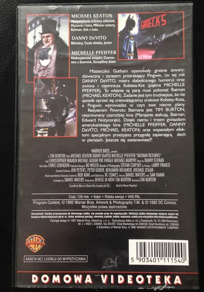 Polską historię kaset video z Batmanem rozpoczął oczywisty tytuł. Warto w tym miejscu wspomnieć, że pomimo sprzeciwu amerykańskich sieci kin, Warner Bros. licząc na ogromne przychody ze sprzedaży kaset w okresie świątecznym postanowiło wydać Batmana Tima Burtona na rynku video rekordowo szybko, bo już 15 listopada 1989 roku (niecałe pięć miesięcy po kinowej premierze). Opłaciła im się ta decyzja, bowiem wielki hit Warnera pobił rekord w ilości sprzedanych kaset, który od kilku lat należał do E.T. Stevena Spielberga. Na początku lat 90. pirackie kopie Batmana, pochodzące między innymi z Azji, zalały bazary w całej Polsce. Poniżej prezentujemy clip z jednej z takich kaset, na potrzeby której zrealizowano wersję lektorską czytaną przez nieodżałowanego Tomasza Knapika.
