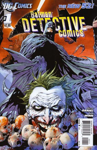 Sam komiks zaczyna się dosyć mrocznie, tak jak powinien zaczynać się komiks o Gotham. Pełen brutalności, krwi i Batmana, co świetnie odzwierciedla okładka. Tak przy okazji, znajoma kreska, czyż nie? To dlatego, że komiks rysuje Tony Daniel, który stworzył wcześniej obrazki do Battle for The Cowl, więc i tutaj oprawa graficzna stoi na wysokim poziomie, ale fabuła… Ona pozostawia sporo do życzenia. Jeśli oczekujecie tego, co było wcześniej w tej serii, tego myślenia, zastanawiania się, to przykro mi, nie tym razem. Akcja, akcja i jeszcze raz akcja. Co jakiś czas pojawiają się przemyślenia Batmana, ale nie pozostawiają one nic dla czytelnika, wiemy wszystko, bo analiza jest na tyle prosta, że nawet dziesięcioletnie dziecko świetnie wie co się wydarzyło, czemu i co prawdopodobnie dziać się dalej będzie. Dlaczego po restarcie pierwsze dwa numery głównych serii związanych z Batmanem są jakby odwrotne? Czemu przy lekturze Batmana więcej myślimy, a mniej się dzieje, podczas gdy przy Detective Comics jest na odwrót? Jeśli jest to jakiś chwyt marketingowy, to przykro nam DC, nie wyszło. Mimo wszystko komiks czyta się bardzo przyjemnie. Końcówka zeszytu jest nieco zaskakująca. Zwłaszcza rysunek, na którym pojawia się odcięta skóra Jokera wisząca na ścianie. Mimo tego, że powinno to teoretycznie przyprawiać o mdłości, to wszyscy widząc to podekscytowali się tym widokiem, a oprócz tego wnikliwe przeczytanie komiksu plus ten obraz dają nam solidne podstawy aby myśleć, że Joker planuje coś dużego, skąd inaczej takie poświęcenie u tej postaci? A skoro mowa o postaciach, to model bohaterów w tym komiksie jest świetnie oddany. Jim Gordon jak zwykle stawia Mrocznego Rycerza ponad wszystko, Joker zwariowany jak zawsze, oprócz tego jego kawały i nagłe salwy śmiechu, Alfred jest może nieco zbyt niezdystansowany w stosunku do Bruce’a, a on sam… No cóż, gdyby nie przypominał aż tak wzorca z serii Batman, to byłby świetnie oddany. Należałoby również choć przez chwilę przyjrzeć się Gotham, aby zobaczyć, że klimat jego jest nie do końca dobrze oddany. Same budynki i wszędobylski dym unoszący się z kanalizacji są niemal idealne, ale kolory pokazują raczej zbyt jasne budowle jak na tak mroczne miejsce, centrum zbrodni świata. Poprawiają to jednak ujęcia bloków z bliska, dworzec, czy nie najgorzej przedstawiony zakład dla obłąkanych Arkham.