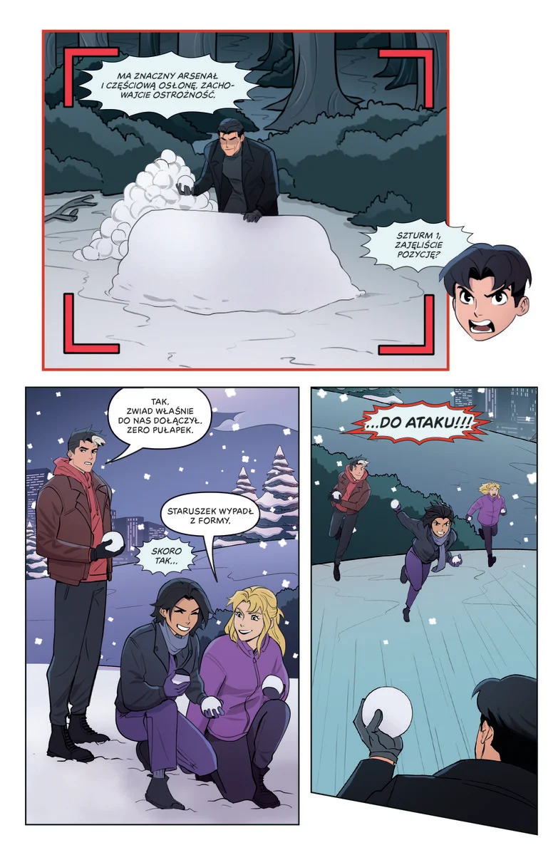 Bruce Wayne i Alfred Pennyworth są doskonałymi opiekunami – zawsze gotowi wysłuchać zmartwionych bliskich, dostarczyć deser do szkoły czy dzielić się wiedzą na temat strategii. Zazwyczaj jednak dyżurują przy komunikatorze, by upewnić się, że każdy wróci bezpiecznie do domu. Pierwszy śnieg w roku to jednak wyjątkowa okazja, by zaprezentować na żywo swoje umiejętności. Zwłaszcza że Batman i Alfred ruszają do ataku! A kiedy śnieg stopnieje, wracamy do zwykłych spraw pogromców zbrodni: szpanowania gadżetami, podkradania się do rodzeństwa, wzywania brata na ratunek czy wymyślania najwygodniejszej pozycji na plecach sprintera.